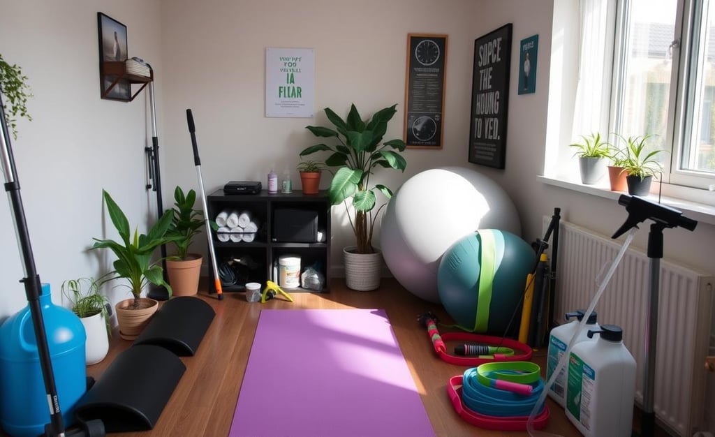 A cozy small home gym featuring budget-friendly workout equipment, including a yoga mat, dumbbells, resistance bands, and a stability ball, alongside cleaning supplies like a mop and disinfectant spray. The space is well-organized with a few potted plants for a touch of greenery, soft natural light streaming through a window, and motivational posters on the wall, creating an inviting atmosphere for maintenance and fitness.