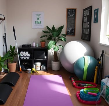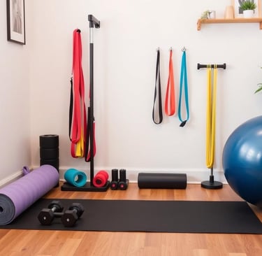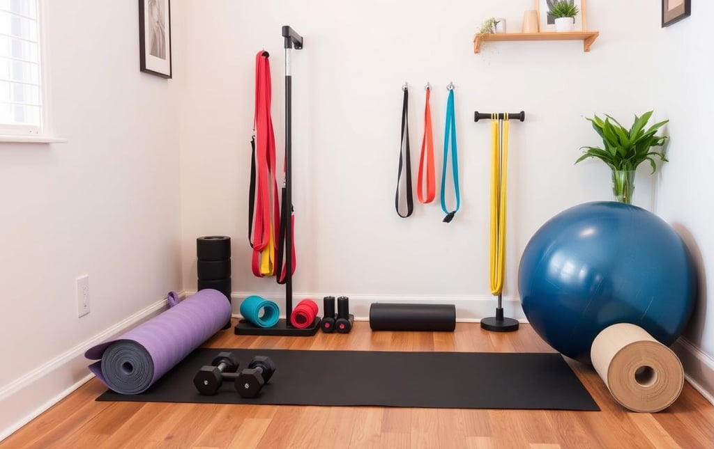 A compact home gym setup featuring essential equipment such as a yoga mat, dumbbells, resistance bands, a stability ball, and a foam roller, arranged neatly in a cozy, well-lit corner of a room with wooden flooring and minimalistic decor.