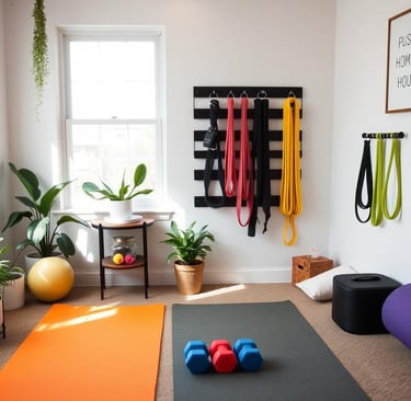 A cozy small home gym setup with budget-friendly fitness essentials, featuring colorful yoga mats, compact dumbbells, a wall-mounted resistance band station, and motivational wall art. Soft natural light filtering in through a window, plants for ambiance, and a minimalist design that emphasizes functionality and cleanliness.