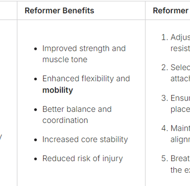 One big plus of the reformer is how it helps with proper form and alignment. The sliding carriage and adjustable springs keep you in the right posture and engage the right muscles. This focus on form makes the workout more effective, helps prevent injuries, and improves movement patterns.
